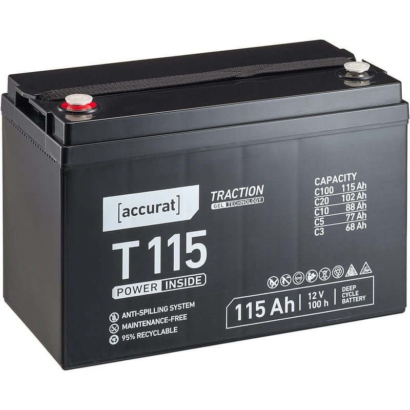 Mit ihrer fortschrittlichen GEL-Technologie bietet die Accurat Traction T115 eine Reihe von Vorteilen gegenüber herkömmlichen Blei-Säure-Batterien. Sie ist wartungsfrei, auslaufsicher und äußerst robust, was sie zur idealen Wahl für anspruchsvolle Anwendungen macht. Entdecken Sie die Freiheit und Unabhängigkeit, die Ihnen diese leistungsstarke Batterie ermöglicht!