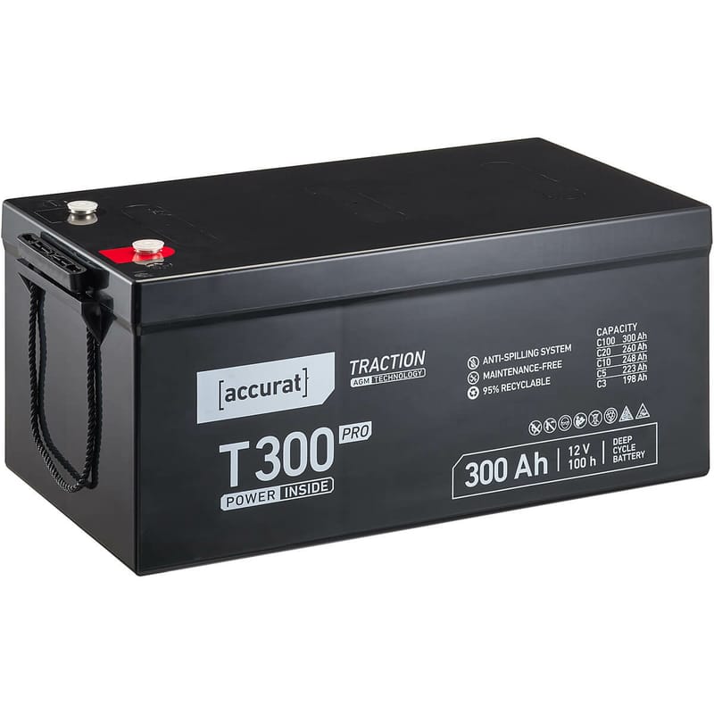 Die Accurat Traction T300 Pro ist eine Hochleistungs-AGM (Absorbent Glass Mat) Bleiakku, die speziell für anspruchsvolle Anwendungen entwickelt wurde. Ob im Wohnmobil, Boot, Solarsystem oder in anderen Anwendungen, die eine zuverlässige und langlebige Stromversorgung benötigen – diese Batterie wird Sie nicht im Stich lassen. Tauchen wir ein in die Welt der Accurat Traction T300 Pro und entdecken Sie, was diese Batterie so besonders macht!