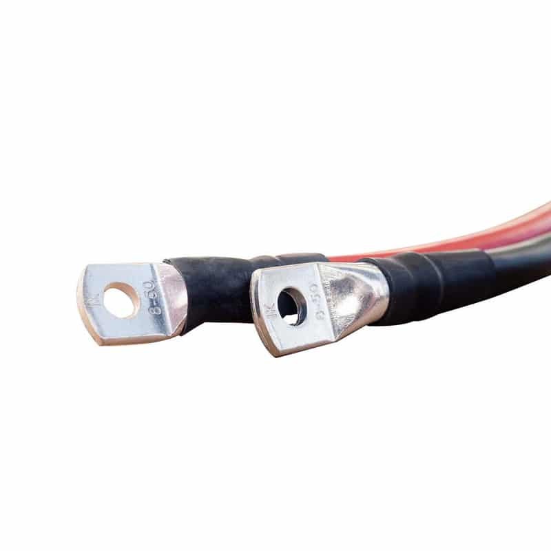 Der Kabelsatz besteht aus zwei Kabeln: einem roten Kabel für den Pluspol und einem schwarzen Kabel für den Minuspol. Beide Kabel haben einen Querschnitt von 50mm². Dieser großzügige Querschnitt sorgt dafür, dass auch bei hohen Strömen nur minimale Verluste auftreten. Die Kabel sind aus hochwertigem Kupfer gefertigt, das für seine hervorragende Leitfähigkeit bekannt ist. Die Isolation besteht aus einem robusten und widerstandsfähigen Material, das den Kabelsatz vor äußeren Einflüssen schützt.